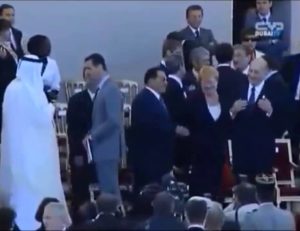 في أثناء الزحام اقترب كاتساف من الأسد مادًا يده ولم يرفضها الأخير، بحسب ما تداولته وسائل إعلام عربية وأجنبية، وبعد تصريحات كاتساف نفسه لوسائل إعلام إسرائيلية عقب عودته.