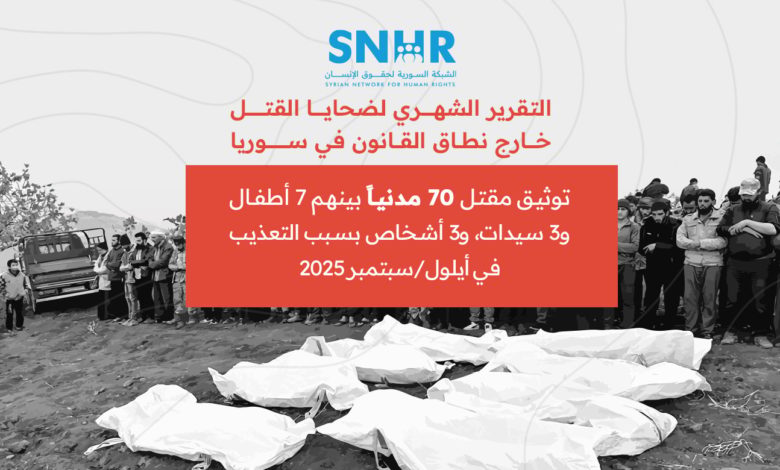دمشق –قالت الشَّبكة السورية لحقوق الإنسان في تقريرها الصادر اليوم إنَّ 70 مدنياً قد قتلوا في سوريا في أيلول/ سبتمبر 2025، بينهم 7 أطفال و3 سيدات، و3 بسبب التعذيب.