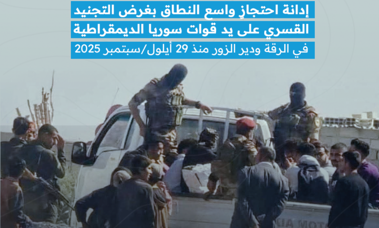 تدين الشَّبكة السورية لحقوق الإنسان جميع أشكال التجنيد الإجباري التي تمارسها قوات سوريا الديمقراطية، والتي شهدت تصاعداً ملحوظاً في الآونة الأخيرة، ولا سيّما عبر عمليات احتجاز ومداهمة تستهدف المدنيين والأطفال وطلاب المعاهد. وتؤكّد الشَّبكة أنّ هذه الممارسات تُشكّل انتهاكاً صارخاً للقانون الدولي الإنساني والقانون الدولي لحقوق الإنسان، ولا سيما اتفاقية حقوق الطفل التي تحظر تجنيد الأطفال أو إشراكهم في الأعمال العسكرية. كما تُنفّذ هذه العمليات خارج إطار القانون، بأساليب مُهينة وتمسُّ الكرامة الإنسانية، ومن دون إبلاغ المحتجزين أو ذويهم بمصيرهم.