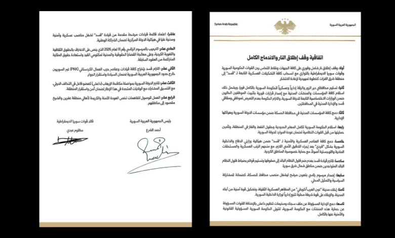 وقّع الرئيس السوري أحمد الشرع على اتفاق ينص على وقف إطلاق نار شامل مع قوات سوريا الديمقراطية (قسد)، والاندماج الكامل في الدولة السورية، بعد لقاء مع المبعوث الأميركي إلى سوريا توم باراك، فيما لم يصدر أي بيان من “قسد” بخصوص الاتفاق.