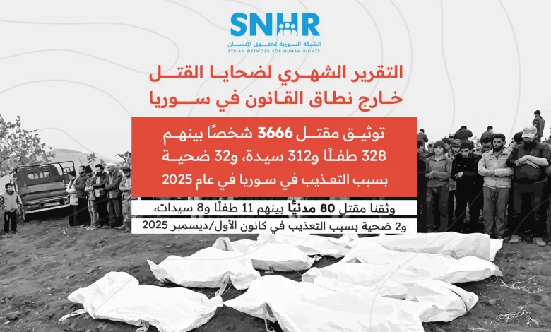 دمشق –قالت الشَّبكة السورية لحقوق الإنسان في تقريرها الصادر اليوم إنَّ 80 مدنياً قد قتلوا في سوريا في كانون الأول/ديسمبر 2025، بينهم 11 طفلاً و8 سيدات، و2 ضحية بسبب التعذيب. كما وثقت الشَّبكة السورية لحقوق الإنسان مقتل 3338 شخصًا في عام 2025، بينهم 328 طفلًا و312 سيدة، و32 ضحية بسبب التعذيب.