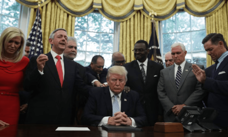 من كان ليصدق المشهد الذي بثته عشرات وسائل الإعلام الأميركية بعد أسبوع من إعلان الحرب على إيران لو عُرض قبل سنتين أو ثلاث سنوات في عهد الرئيس الأميركي بايدن: مشهد لعشرين مسؤولًا أميركيًا يحيطون بدونالد ترامب، رئيس أقوى دولة في العالم، وهو يجلس وراء مكتب، بالقرب منه مستشارته الروحية الشهيرة في فيديو تنادي فيه بأسماء غريبة ادّعت أنها أسماء ملائكة. وفي طرف الحلقة يقف رجل دين يدعو الرئيس بالقوة والدعم الإلهي في حربه على إيران، فيردد الحشد الواقف “آمين”، فتترسم علامات التأثر والخشوع في وجوه الجميع.
