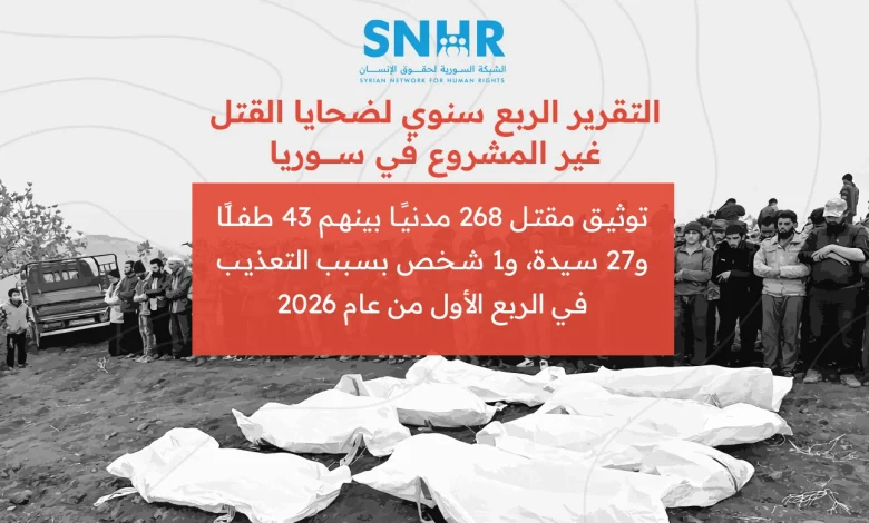 أصدرت الشَّبكة السورية لحقوق الإنسان اليوم تقريرها الفصلي عن حصيلة القتل غير المشروع والاعتداءات على الأعيان المدنية في سوريا خلال الربع الأول من عام 2026، موثقة مقتل 268 مدنيًا، بينهم 43 طفلًا و27 سيدة، إضافة إلى وفاة شخص واحد بسبب التعذيب، وتسجيل 4 مجازر خلال الفترة الممتدة من كانون الثاني/يناير حتى نهاية آذار/مارس 2026. كما وثق التقرير مقتل 8 من الكوادر الطبية وعنصر واحد من الكوادر الإعلامية ضمن الحصيلة الإجمالية.