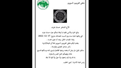 يتقدّم التنظيم الشعبي الناصري بأحرّ التعازي إلى الإخوة في سوريا، في حزب الاتحاد الاشتراكي العربي الديمقراطي، وإلى الأمين العام المهندس أحمد العسراوي، وإلى عائلة الفقيد الكريمة، سائلين الله عزّ وجل أن يتغمّده بواسع رحمته، وأن يُلهم ذويه ومحبيه الصبر والسلوان.