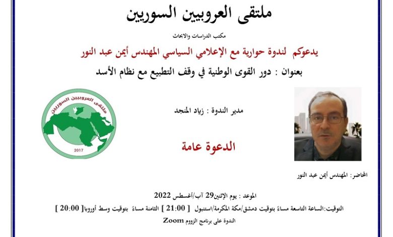 أقام مكتب الدراسات والابحاث بملتقى العروبيين السوريين ليلة الاثنين 29 / 8 / 2022 على منصة الزوم ندوة حوارية بعنوان…