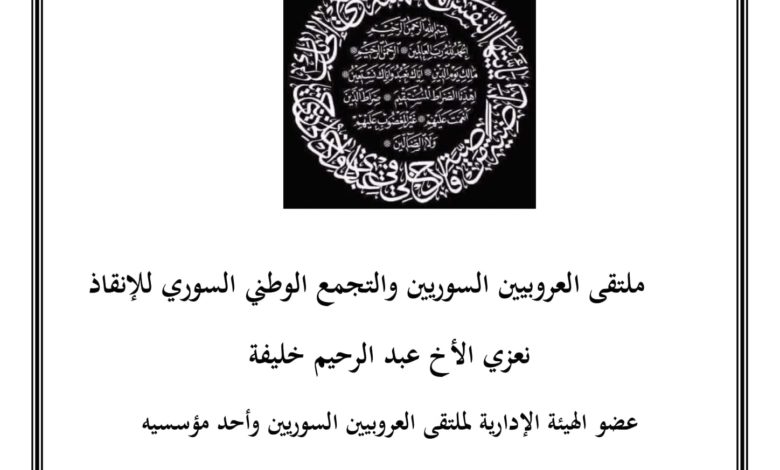 إقرأ المزيد...ملتقى العروبيين السوريين والتجمع الوطني السوري للإنقاذ نعزي الأخ عبد الرحيم خليفة عضو الهيئة الإدارية لملتقى العروبيين السوريين وأحد مؤسسيه…