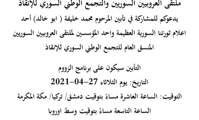 إقرأ المزيد...أقام ملتقى العروبيين السوريين والتجمع الوطني السوري للإنقاذ تأبين المرحوم د.محي الدين بنانة أحد أعلام ثورتنا العظيمة واحد المؤسسين لملتقى…
