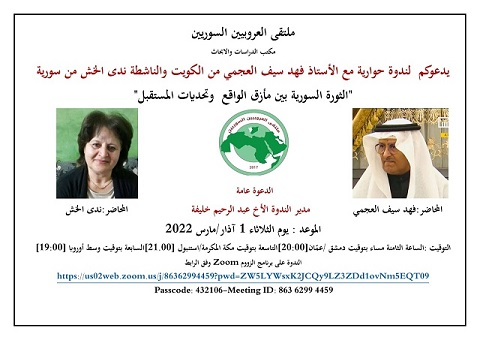 أقام ملتقى العروبيين السوريين (مكتب الدراسات والابحاث) الثلاثاء 1 آذار/مارس *2022 ندوة حوارية مع الأستاذ فهد سيف العجمي من الكويت والناشطة…