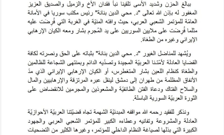 أقام ملتقى العروبيين السوريين والتجمع الوطني السوري للإنقاذ تأبين المرحوم د.محي الدين بنانة أحد أعلام ثورتنا العظيمة واحد المؤسسين لملتقى…